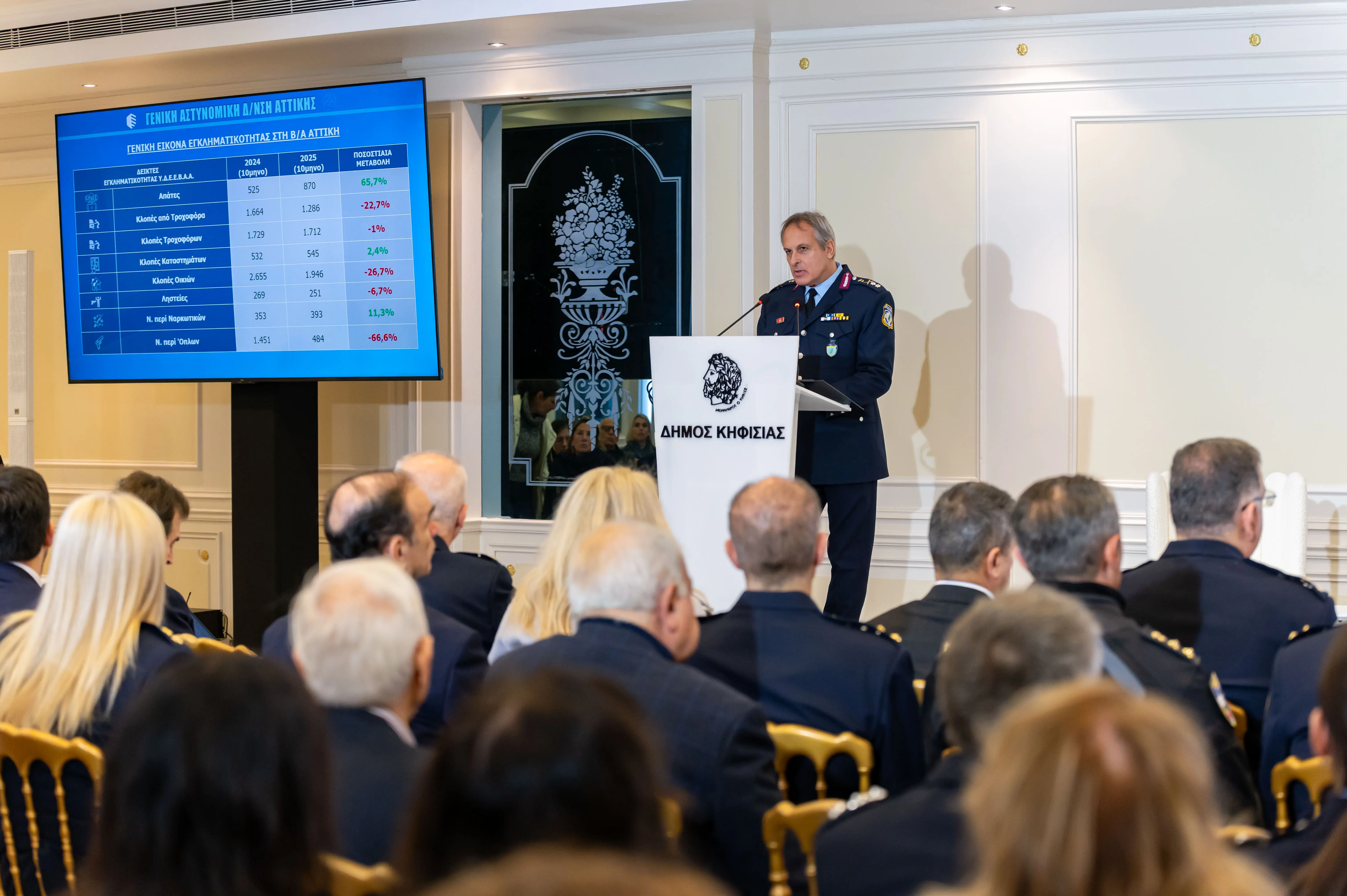 Τη σημαντική μείωση στους δείκτες εγκληματικότητας, ειδικά για την περιοχή της Κηφισιάς, παρουσίασε ο Γενικός Αστυνομικός Διευθυντής Αττικής, Υποστράτηγος Αθανάσιος Κάμπρας. Όπως τόνισε: «Το ειδικό επιχειρησιακό σχέδιο εφαρμόζεται με συνέπεια και μετρήσιμη αποτελεσματικότητα στις περιοχές Κηφισιάς, Διονύσου και Πεντέλης. Η υλοποίηση του σχεδίου πραγματοποιείται καθημερινά, μέσω συνδυασμού εμφανών και μη εμφανών αστυνομικών δράσεων, αξιοποιώντας πλήρως τις διαθέσιμες δυνάμεις των ΟΠΚΕ, ΔΙ.ΑΣ., Τροχαίας και των Υπηρεσιών Ασφαλείας. Η ολοκληρωμένη αυτή επιχειρησιακή προσέγγιση επιτρέπει την άμεση επέμβαση, την αυξημένη επιτήρηση και την αποτελεσματική πρόληψη εγκληματικών ενεργειών. Τα αποτελέσματα της ενίσχυσης αποτυπώθηκαν άμεσα, με αύξηση συλλήψεων από τον Μάιο και σταθεροποίηση σε υψηλότερα επίπεδα έναντι του προηγούμενου έτους. Παράλληλα, καταγράφηκε ουσιαστική άνοδος εξιχνιάσεων, καθώς η ενισχυμένη διαθεσιμότητα προσωπικού επέτρεψε τη σε βάθος διερεύνηση πιο σύνθετων υποθέσεων».