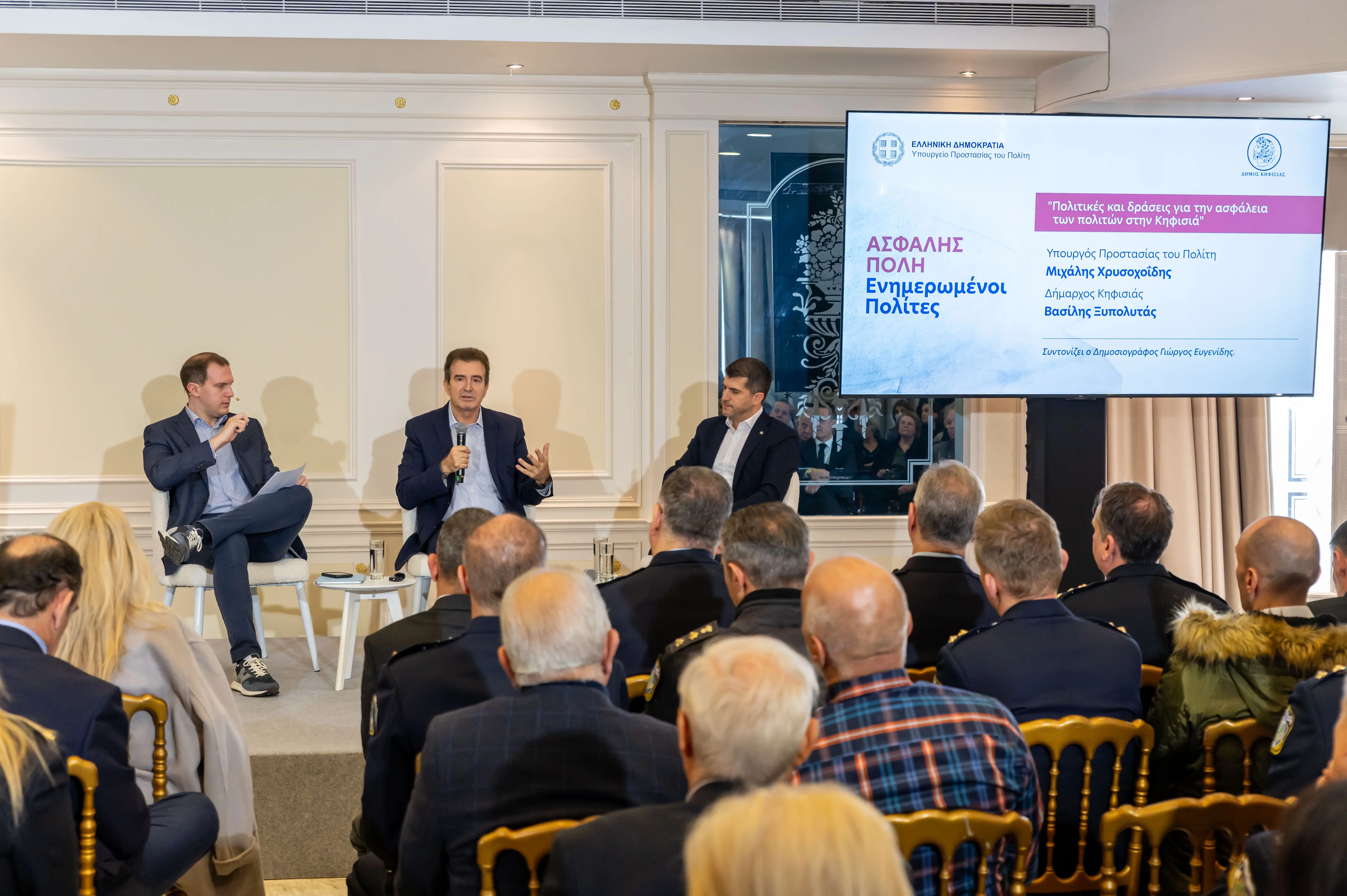 Ενημερωτική εκδήλωση με τίτλο: «Ασφαλής Πόλη: Ενημερωμένοι Πολίτες», πραγματοποίησαν το Υπουργείο Προστασίας του Πολίτη και ο Δήμος Κηφισιάς, το Σάββατο 29 Νοεμβρίου 2025, στην Κηφισιά. Την εκδήλωση συντόνιζε ο δημοσιογράφος Γιώργος Ευγενίδης.