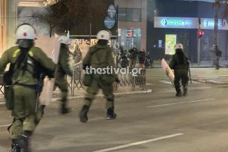 Στη συμβολή των οδών Τσιμισκή και Παύλου Μελά επικράτησε ένταση με αντιεξουσιαστές να πετούν αντικείμενα προς τις αστυνομικές δυνάμεις και δυνάμεις των ΜΑΤ να απαντούν με χειροβομβίδες κρότου λάμψης και δακρυγόνα.
