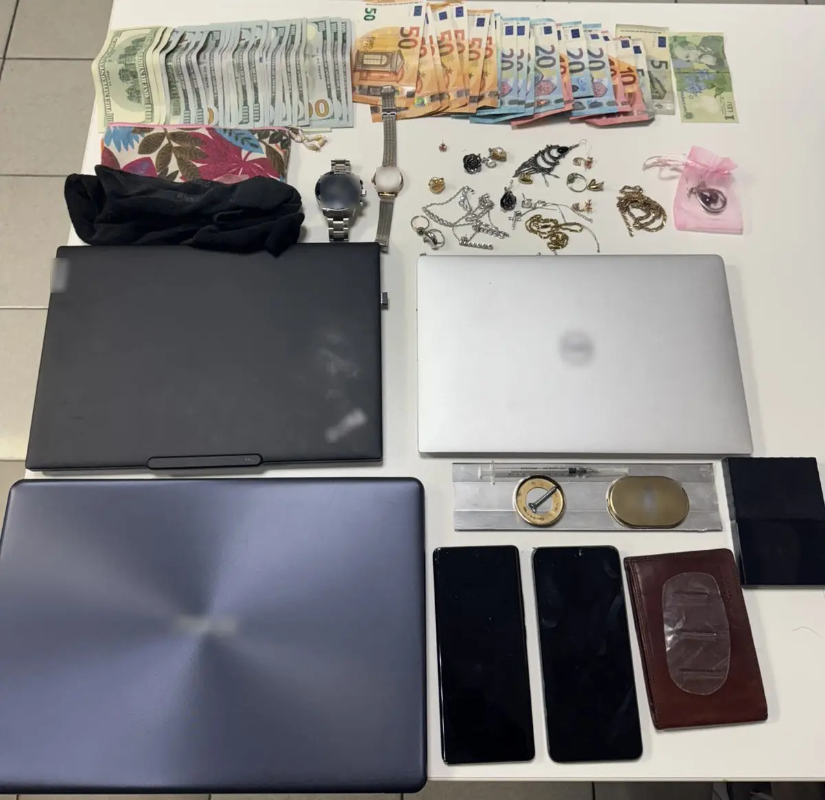 Όπως διαπιστώθηκε από το ανωτέρω διαμέρισμα είχαν αφαιρέσει -3- φορητούς υπολογιστές και κινητό τηλέφωνο, τα οποία βρέθηκαν στην ταράτσα και αποδόθηκαν στον ιδιοκτήτη, ενώ στην κατοχή τους καθώς και σε άλλους χώρους του κτηρίου βρέθηκαν επιπλέον και κατασχέθηκαν: