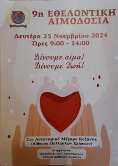 H Τοπική Διοίκηση Κοζάνης της Διεθνούς Ένωσης Αστυνομικών (ΙΡΑ) προσκαλεί τα μέλη της και μη, να προσέλθουν την 25 Νοεμβρίου 2024, ημέρα Δευτέρα και ώρες 09:00΄ – 14:00΄ στην 9η εθελοντική αιμοδοσία που θα πραγματοποιηθεί στην αίθουσα πολλαπλών χρήσεων του Αστυνομικού Μεγάρου Κοζάνης, με μέριμνα του Τμήματος Αιμοδοσίας του Γενικού Κρατικού Νοσοκομείου Κοζάνης «Μαμάτσειου».