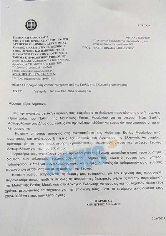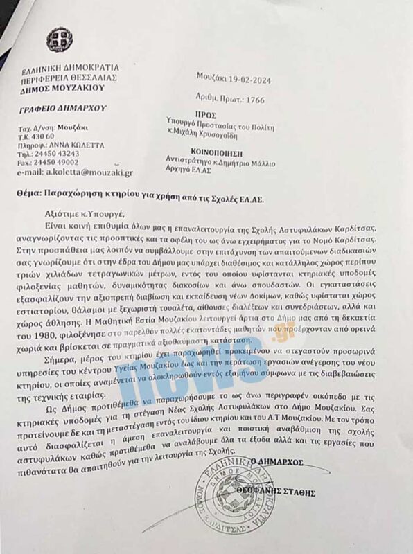 Η παραχώρηση της Μαθητικής Εστίας Μουζακίου στο Αρχηγείο της Ελληνικής Αστυνομίας θα είναι για τουλάχιστον είκοσι (20) χρόνια!