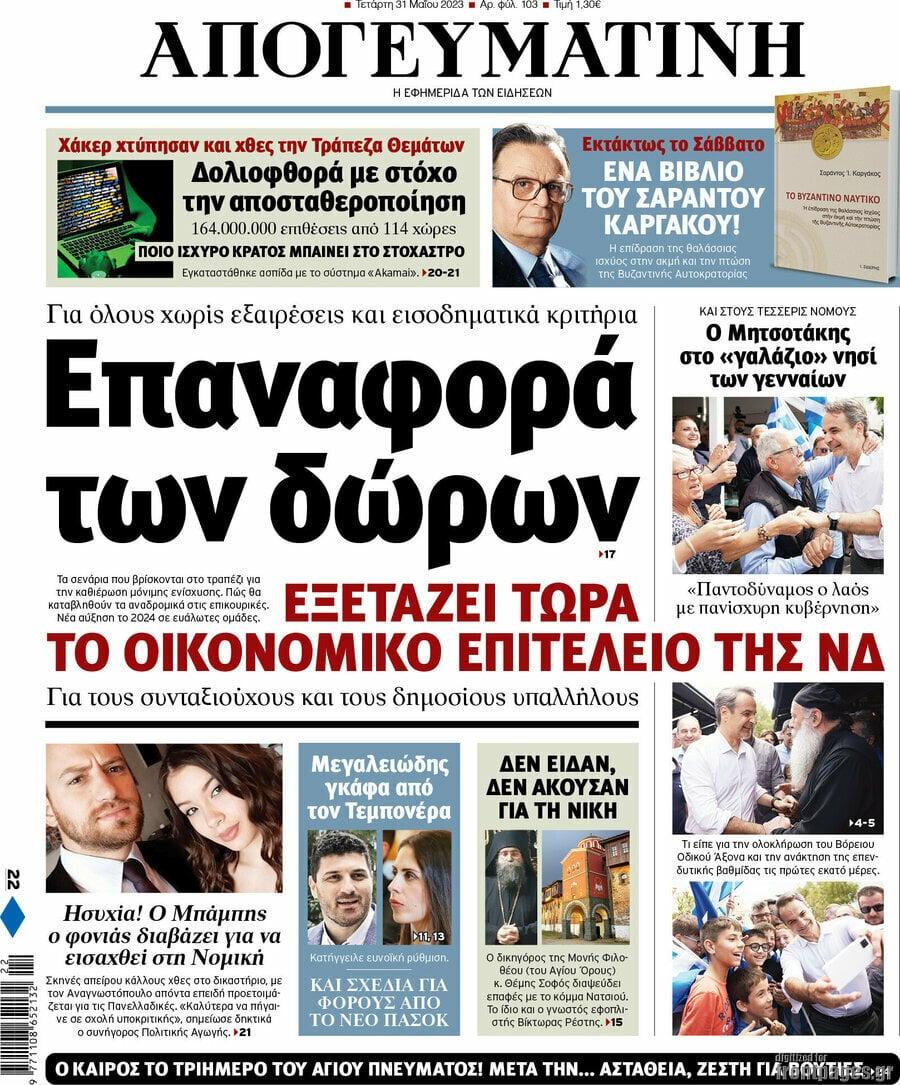 Το Πρωτοσέλιδο της «Απογευματινής» της 31/05/2023: