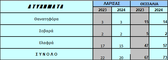 Αντίστοιχα, σε επίπεδο Θεσσαλίας και πάντα για την ίδια χρονική περίοδο, το 2023 συνέβησαν συνολικά 67 ατυχήματα, εκ των οποίων 15 θανατηφόρα, 5 σοβαρά και 47 πιο ελαφρά, ενώ το 2024 το σύνολο των ατυχημάτων ήταν 73, με τα θανατηφόρα να ανέρχονται σε 14, τα σοβαρά τροχαία να είναι 2 και 57 τα πιο ελαφρά.