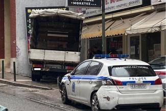 Η “τρελή” πορεία του φορτηγού σταμάτησε μπροστά στην είσοδο καταστήματος. Το ευτύχημα είναι οτι εκείνη την ώρα δεν υπήρχαν πεζοί μπροστά στο κατάστημα.