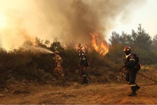 Σύμφωνα με την Πυροσβεστική η φωτιά εκδηλώθηκε γύρω στις 15.40 και κοντά υπάρχουν διάσπαρτες κατοικίες.