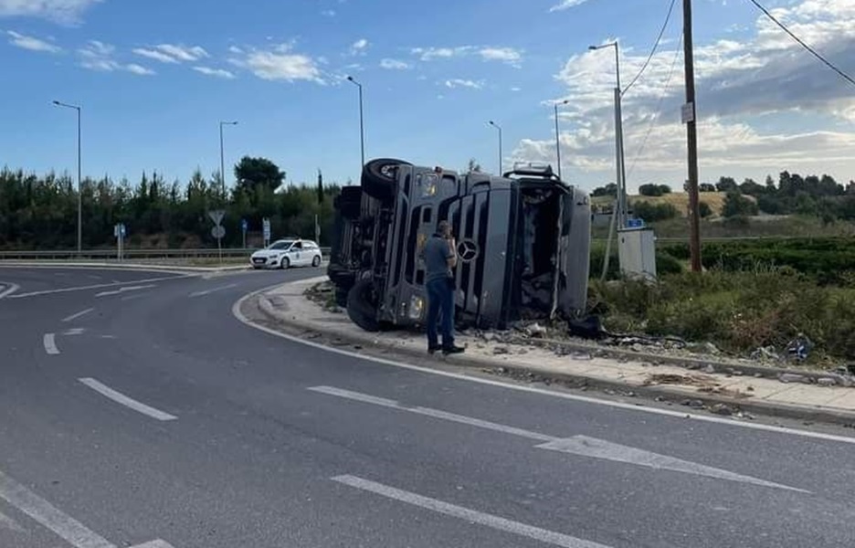Σοβαρό τροχαίο σημειώθηκε στη Χαλκιδική όταν μια νταλίκα τούμπαρε στον κόμβο Κασσανδρείας.
