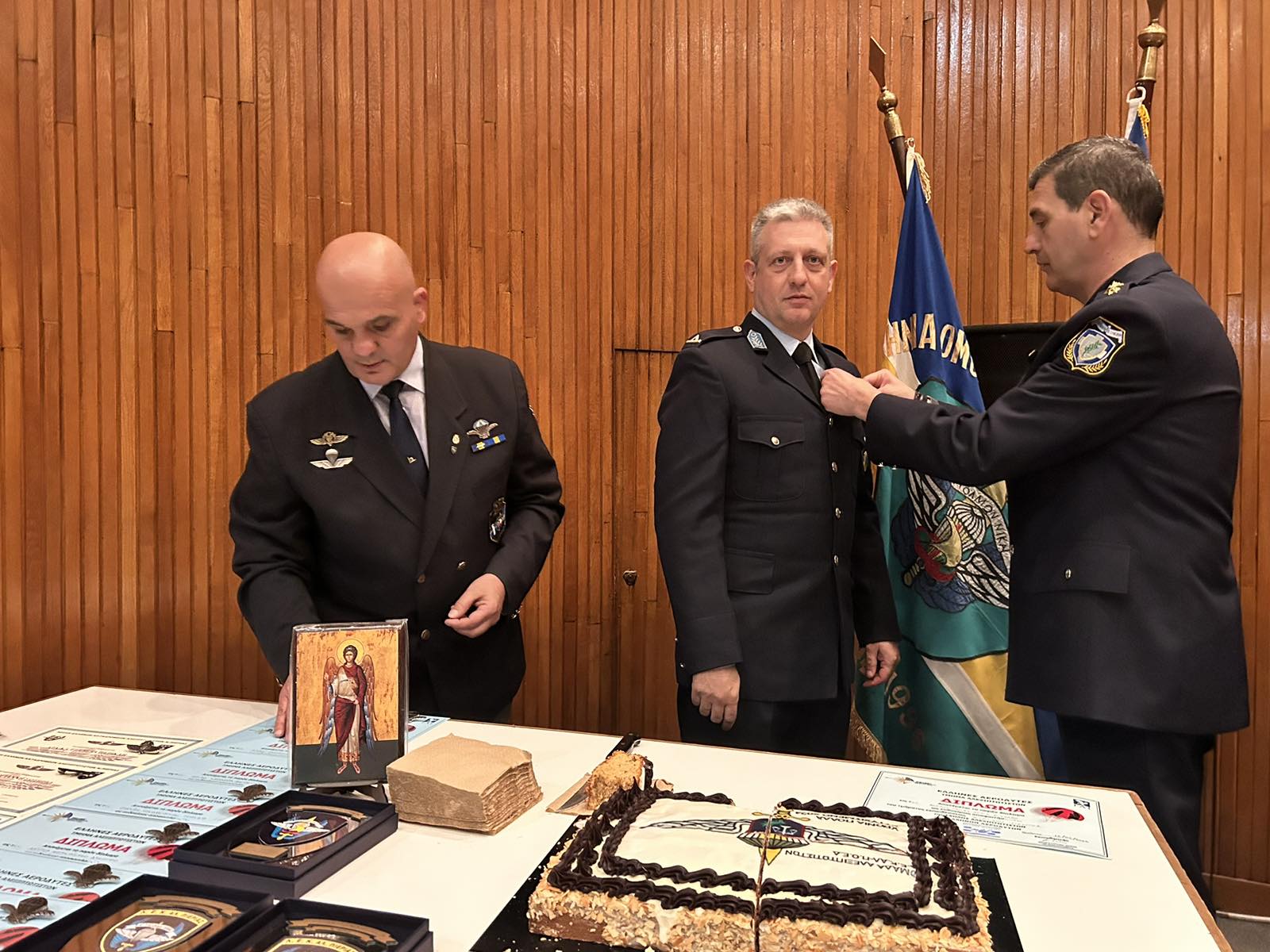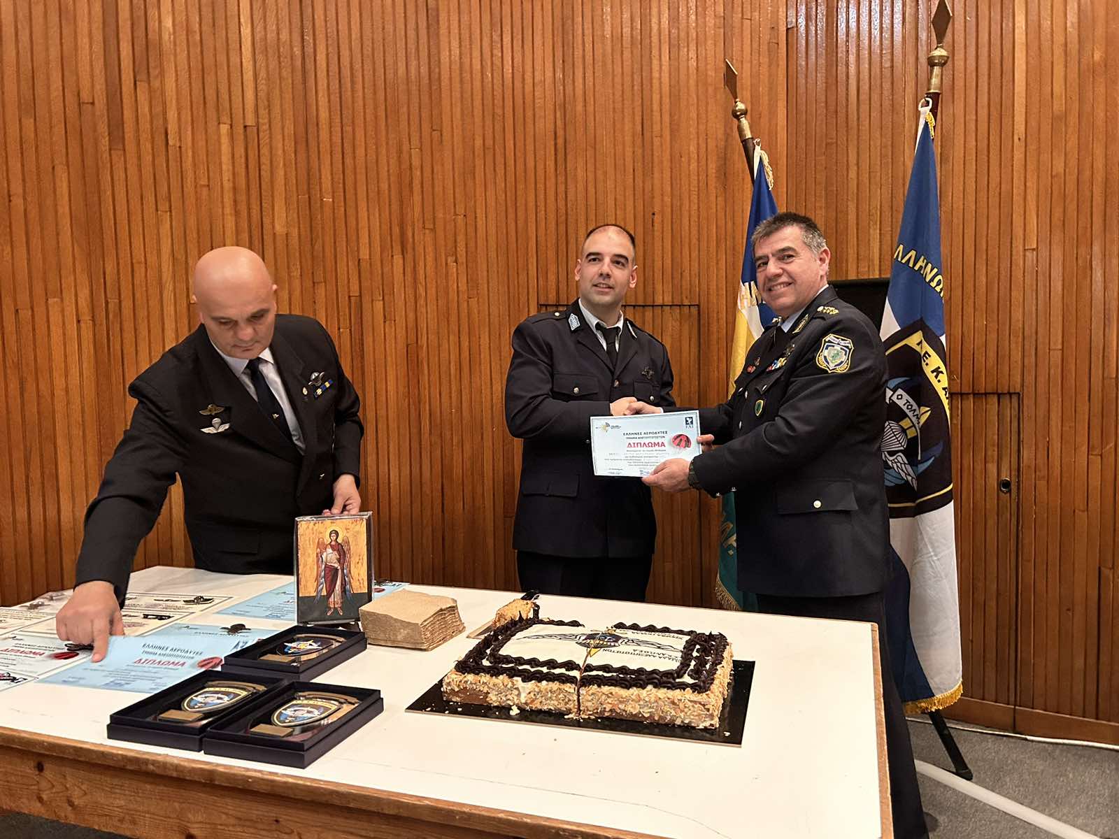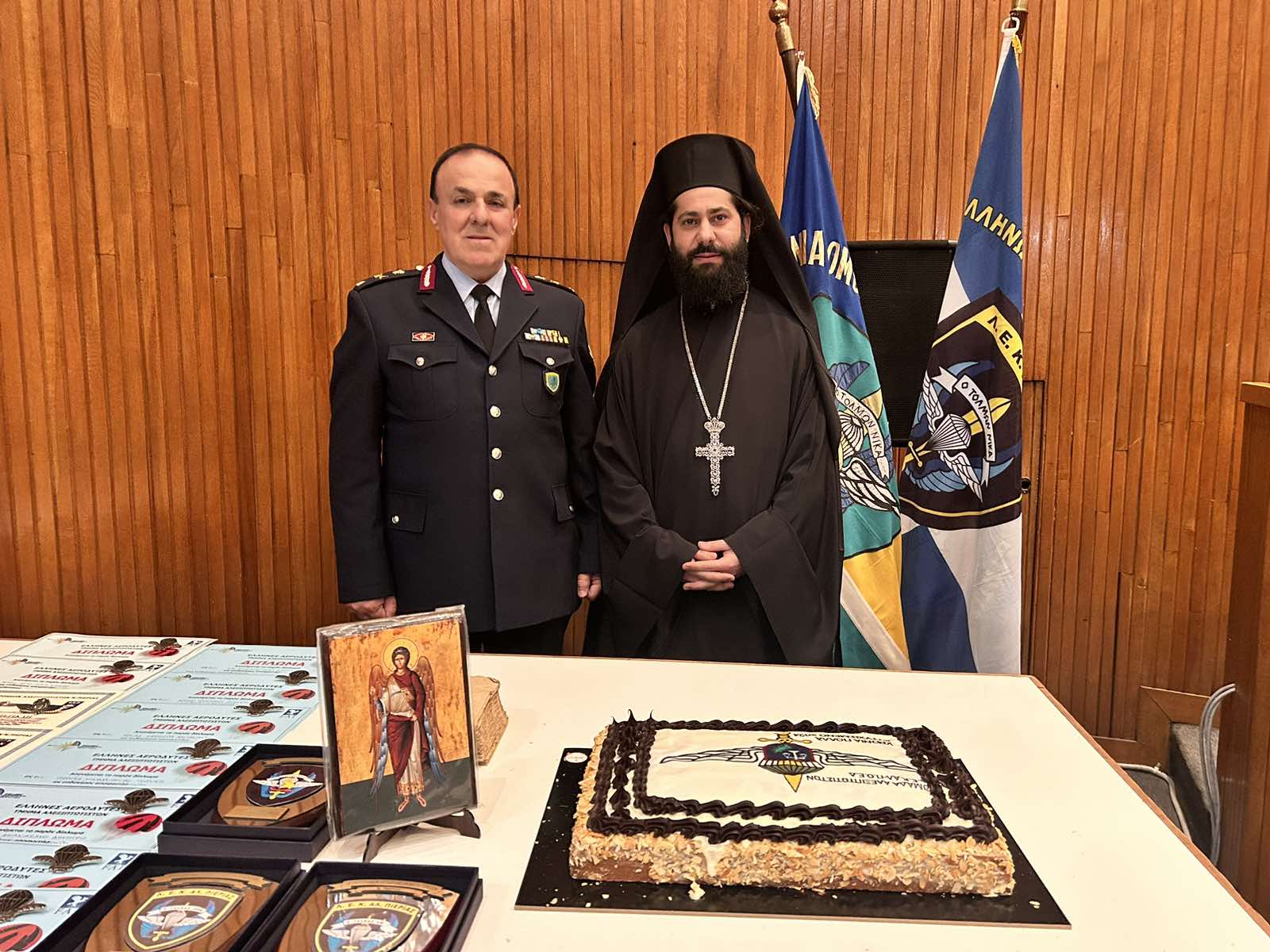 Για τρίτη χρονιά η Ομάδα Αλεξιπτωτιστών-Αστυνομικών της Λέσχης Ελλήνων Καταδρομέων Αλεξιπτωτιστών Πιερίας (Λ.Ε.Κ.ΑΛ.), έκοψε την πρωτοχρονιάτικη βασιλόπιτα χθες (27/2), στο Αμφιθέατρο της Γενικής Αστυνομικής Διεύθυνσης Αττικής.