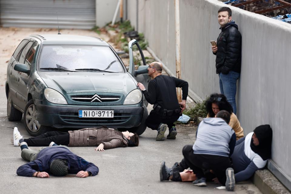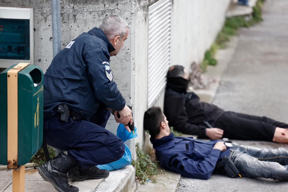 Πανδαιμόνιο επικρατεί στο Μέγαρο, αστυνομικοί με προτεταμένα τα όπλα πλησιάζουν το σημείο και δίνουν τις πρώτες βοήθειες στους συναδέλφους του που κείτονται αιμόφυρτοι στο έδαφος…