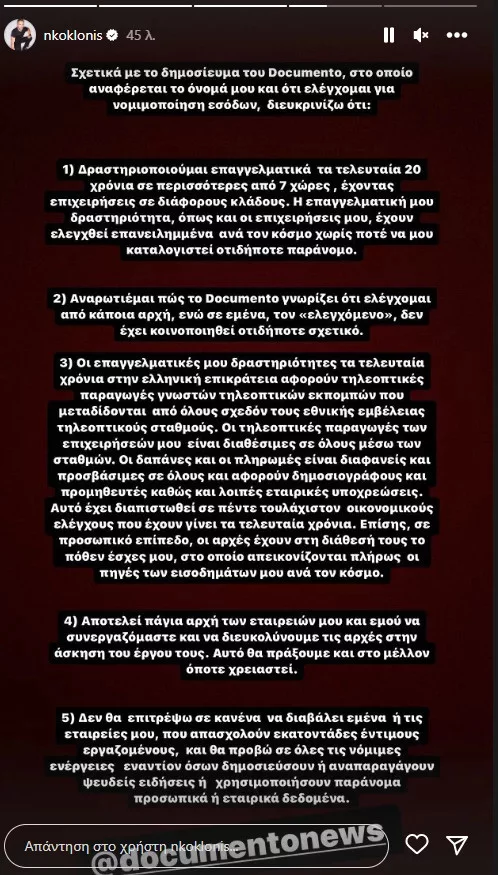 Ο τηλεοπτικός παραγωγός διεμήνυσε πως θα προβεί «σε όλες τις νόμιμες ενέργειες εναντίον όσων δημοσιεύσουν ή αναπαραγάγουν ψευδείς ειδήσεις ή χρησιμοποιήσουν παράνομα προσωπικά ή εταιρικά δεδομένα».