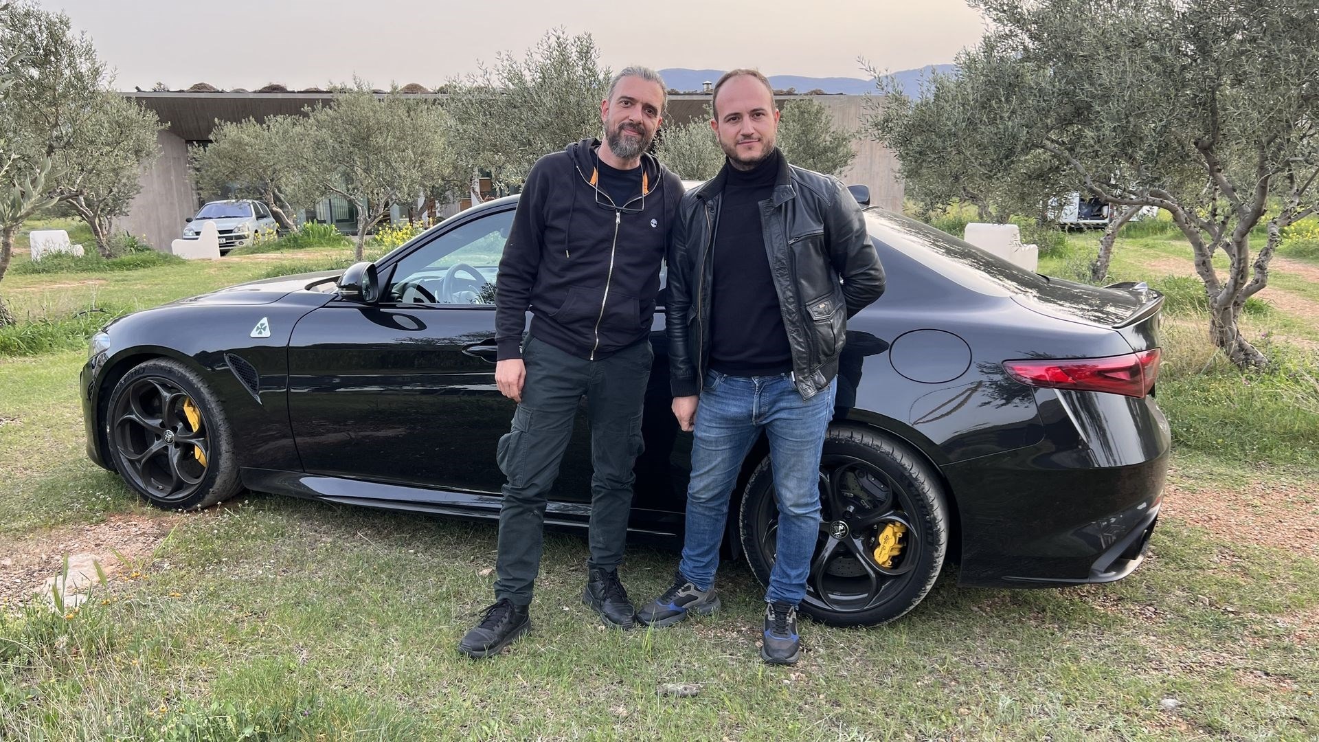 Ο Σωτήρης Τσαφούλιας, σκηνοθέτης του Έτερος Εγώ: Νέμεσις (αριστερά) με τον Βασίλη Παπουτσή της Alfa Specialists που παρείχε την Alfa Romeo Giulia Quadrifoglio.