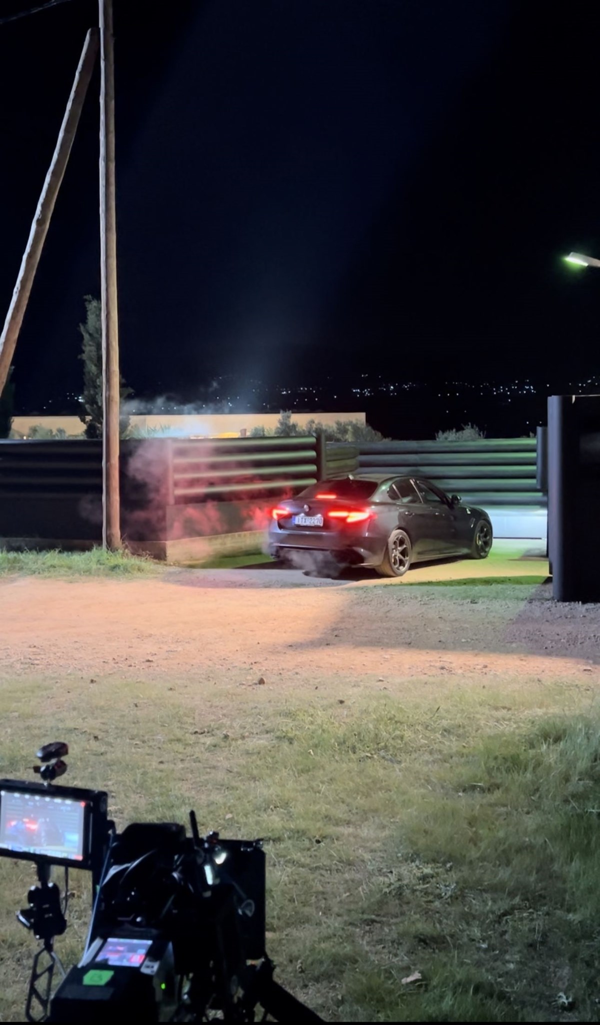 Έτσι όταν ήρθε η ώρα για τα γυρίσματα, πίσω στον Απρίλιο του 2022, η Alfa Specialists έφτασαν στην Αθήνα με δύο Alfa Romeo Giulia Quadrifoglio, μια λευκή και μια μαύρη. Αποδείχτηκε πως η επιλογή ήταν σοφή γιατί το λευκό αυτοκίνητο, όσο εντυπωσιακό και αν είναι για έναν γάμο ή για να φύγεις από την βάπτιση του παιδιού σου, δεν ταιριάζει όσο το μαύρο για να μεταβαίνει ο αρχηγός της συμμορίας στο κρησφύγετο.