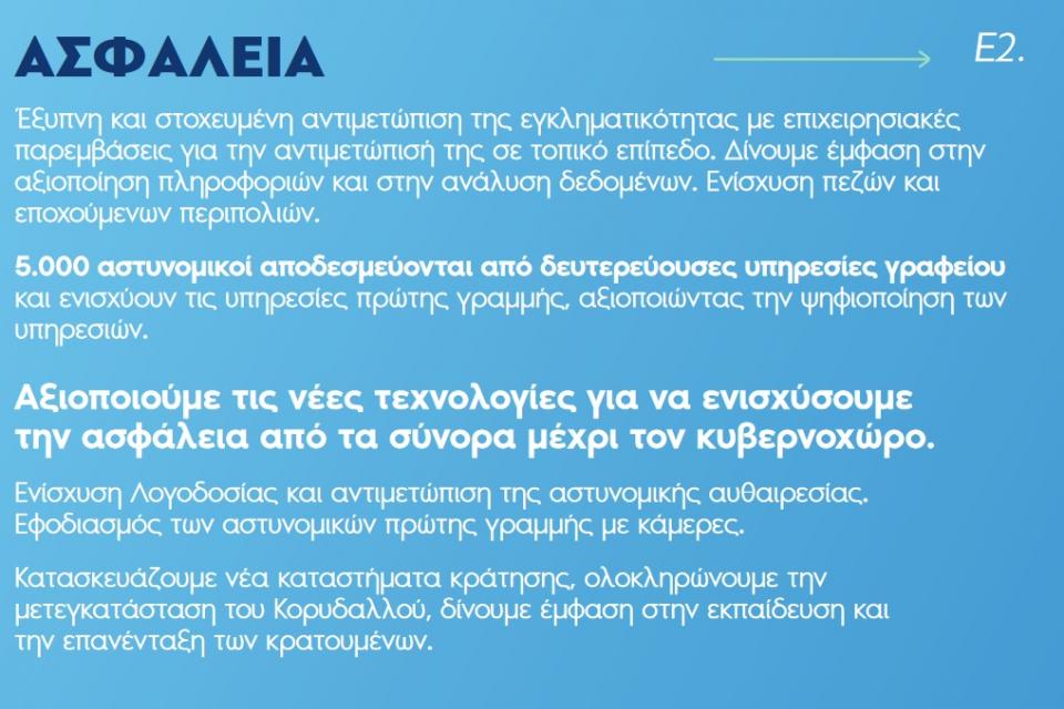 Το πρόγραμμα διακυβέρνησης 2023 - 2027 της Νέας Δημοκρατίας περιλαμβάνει τα εξής σημεία για την Ασφάλεια στη χώρα και την Ελληνική Αστυνομία: