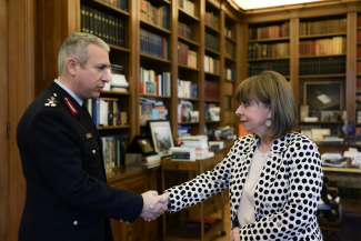 Εθιμοτυπική συνάντηση πραγματοποίησε σήμερα, Παρασκευή 01 Μαρτίου 2024, η Α.Ε. η Πρόεδρος της Ελληνικής Δημοκρατίας Αικατερίνη Σακελλαροπούλου με τον Αρχηγό της Ελληνικής Αστυνομίας, Αντιστράτηγο Δημήτριο Μάλλιο στο πλαίσιο ανάληψης των καθηκόντων του.