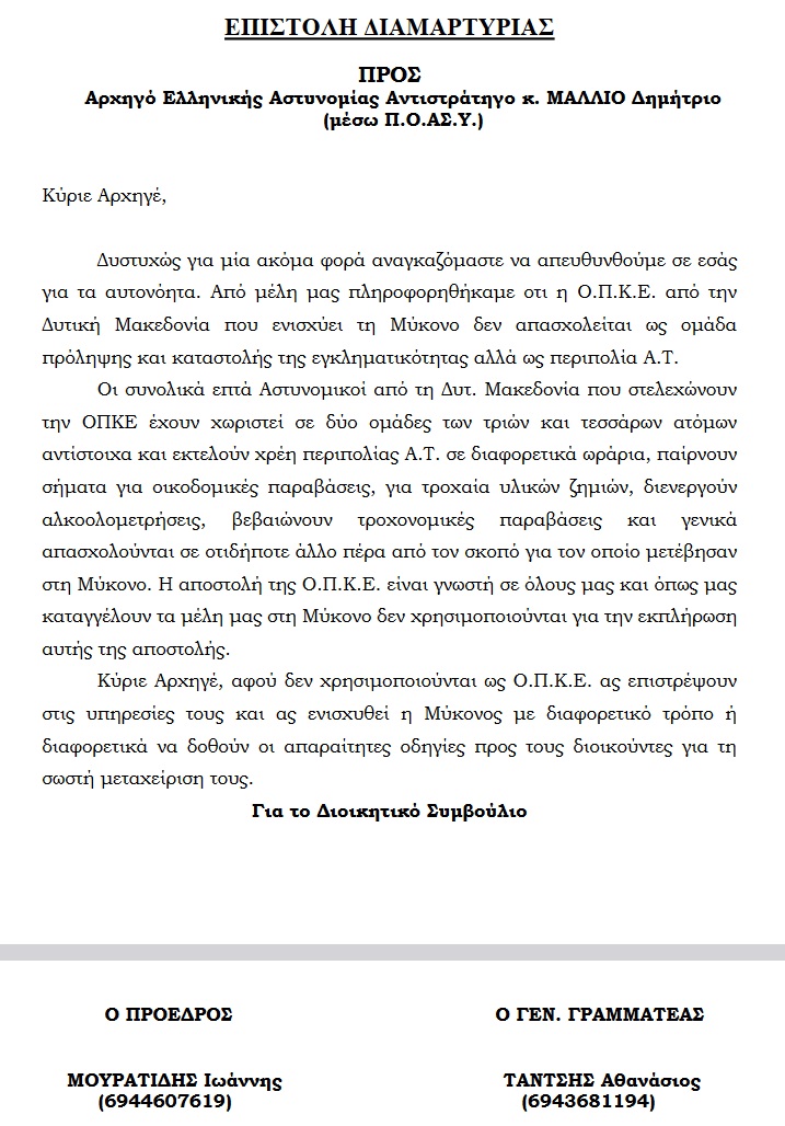 Η Ένωση Αστυνομικών Υπαλλήλων Φλώρινας, με το επισυναπτόμενο έγγραφό της διαμαρτύρεται γιατί, σύμφωνα με καταγγελίες, οι αστυνομικοί της Ο.Π.Κ.Ε. από την Δυτική Μακεδονία που μετέβησαν στη Μύκονο, δεν απασχολούνται στο νησί ως Oμάδα Πρόληψης και Καταστολής της Εγκληματικότητας, αλλά ως περιπολία Α.Τ.
