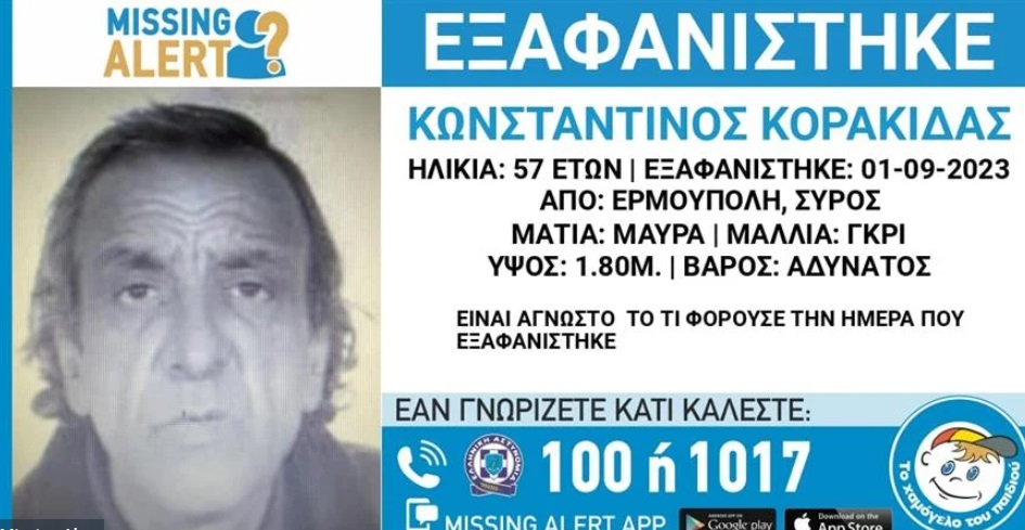 Ειδικότερα, την Παρασκευή 1 Σεπτεμβρίου 2023, μεσημβρινές ώρες, εξαφανίστηκε από τη Σύρο ο Κωνσταντίνος Κοκαρίδης, 57 ετών.