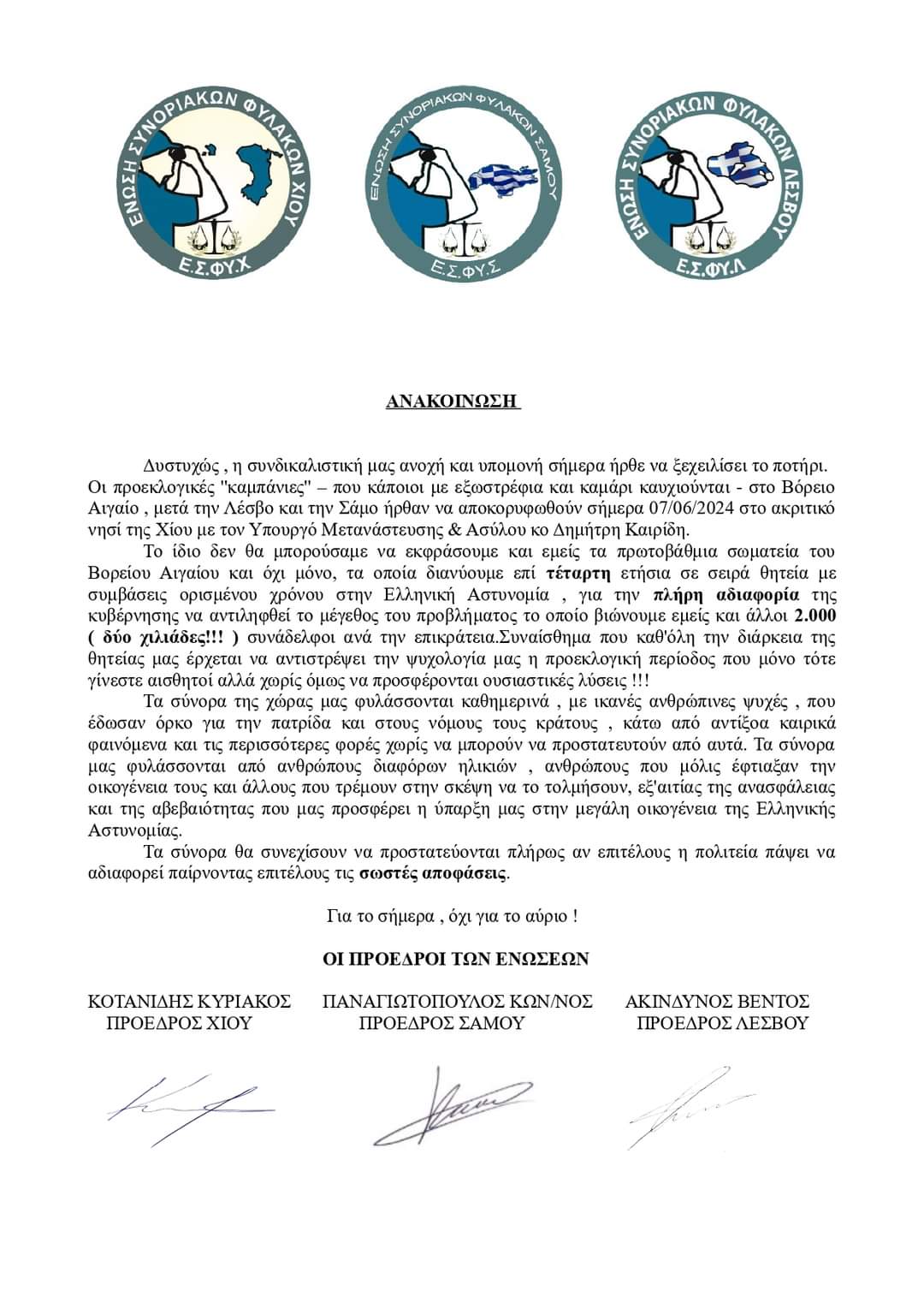 Όπως χαρακτηριστικά αναφέρουν στην κοινή ανακοίνωση τους οι Ενώσεις Συνοριοφυλάκων Β. Αιγαίου "Η Αδιαφορία της Κυβέρνησης καλά κρατεί "