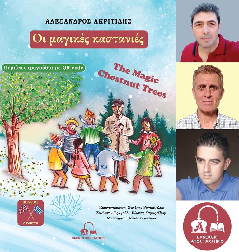 Μόλις κυκλοφόρησαν «Οι μαγικές καστανιές» το όγδοο βιβλίο του Ανθυπολοχαγού (ΤΧ) Αλέξανδρου Ακριτίδη. Ένα παιδικό βιβλίο με ξεχωριστή σημασία για τις Ένοπλες Δυνάμεις καθώς όλοι οι συντελεστές του εργάζονται στο 308 Προκεχωρημένο Εργοστάσιο Βάσης (308 ΠΕΒ), το οποίο εδρεύει στη Θεσσαλονίκη. Και συγκεκριμένα, εκτός από τον συγγραφέα, τη μουσική έγραψε αλλά και τραγουδάει, ο Επχίας (ΤΧ) Κώστας Σαμαρτζίδης, ενώ την εικονογράφηση έκανε ο Μόνιμος Υπάλληλος ΥΠ.Ε.ΘΑ Θανάσης Ρηγόπουλος. Το βιβλίο είναι δίγλωσσο (Ελληνικά – Αγγλικά) και διαδραστικό, καθώς με κώδικα QR τα παιδιά μπορούν να ακούσουν τα τραγούδια σε άμεσο χρόνο. Κυκλοφορεί από τις Εκδόσεις Αποστακτήριο και μπορείτε να το ζητήσετε σε κάθε βιβλιοπωλείο.
