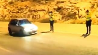 Στην κάμερα, μάλιστα, καταγράφηκε η στιγμή, που ένα γκρι «φτιαγμένο» αυτοκίνητο έρχεται με μεγάλη ταχύτητα και «κοκκαλώνει», όταν του κάνουν νόημα οι αστυνομικοί να σταματήσει.