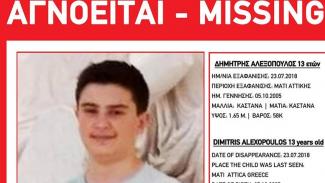 Missing alert εξέδωσε το Χαμόγελο του Παιδιού για τον 13χρονο Δημήτρη Αλεξόπουλο που αγνοείται από τις 23 Ιουλίου μετά την πυρκαγιά στο Μάτι.