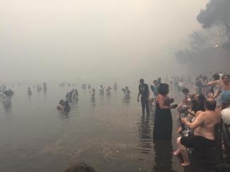 «Στις 18:40 πέσαμε στο νερό. Ο ήλιος ήταν ψηλά, αλλά ήταν νύχτα για εμάς. Μπαίνουμε στη θάλασσα μέχρι το λαιμό για να βάζουμε γρήγορα τα κεφάλια μας μέσα γιατί πεταγόντουσαν καυτά κουκουνάρια πάνω μας που ήταν σαν πυροτεχνήματα. Βλέπω έναν κύριο δίπλα μου να κρατάει ένα μωρό που είναι το γνωστό μωρό που έχασε τη ζωή του, με τα πόδια του καμμένα», τόνισε αρχικά.