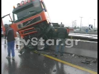 Το μεγάλο όχημα έπεσε πάνω στο τσιμεντένιο στηθαίο, το οποίο και κατέστρεψε.