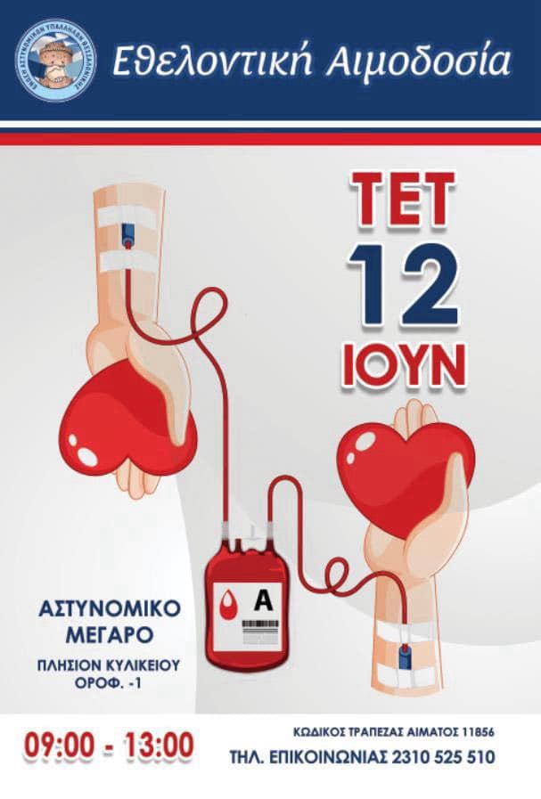 Ας δώσουμε όλοι το παράδειγμα και ας γίνουμε πρεσβευτές της αλληλεγγύης και της προσφοράς. Σας περιμένουμε να συμμετάσχετε στην αιμοδοσία την Τετάρτη 12 Ιουνίου στην Γενική Αστυνομική Διεύθυνση Θεσσαλονίκης