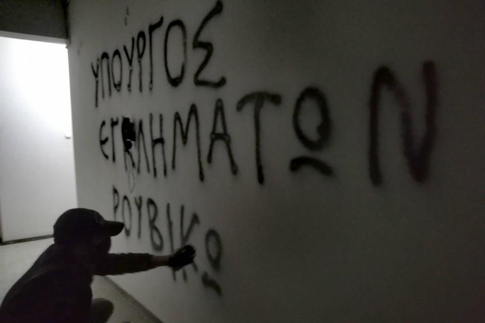 Παρέμβαση με συνθήματα στους εξωτερικούς τοίχους του γραφείου του πρώην υπουργού Μεταφορών Κώστα Αχ. Καραμανλή έκαναν το απόγευμα του Σαββάτου μέλη της ομάδας "Ρουβίκωνας".