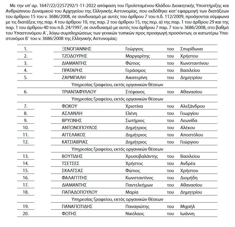 Νέες προαγωγές Αξιωματικών της ΕΛ.ΑΣ. περιλαμβάνονται σε σχετική απόφαση του Προϊσταμένου Κλάδου Διοικητικής Υποστήριξης και Ανθρωπίνου Δυναμικού του Αρχηγείου της ΕΛ.ΑΣ..