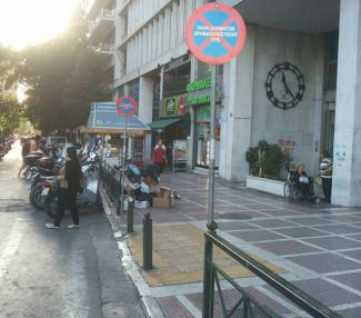 "Κατά τη διάρκεια εκτέλεσης της υπηρεσίας μου διαπίστωσα ότι ρυθμιστικές πινακίδες Ρ40 (άρθρο 4 ΚΟΚ) απαγόρευαν τη στάση και στάθμευση σε διάβαση πεζών και σε ράμπα για ΑμεΑ, εξαιρώντας οχήματα χρηματαποστολής συγκεκριμένης τράπεζας (πρώτη φώτο).