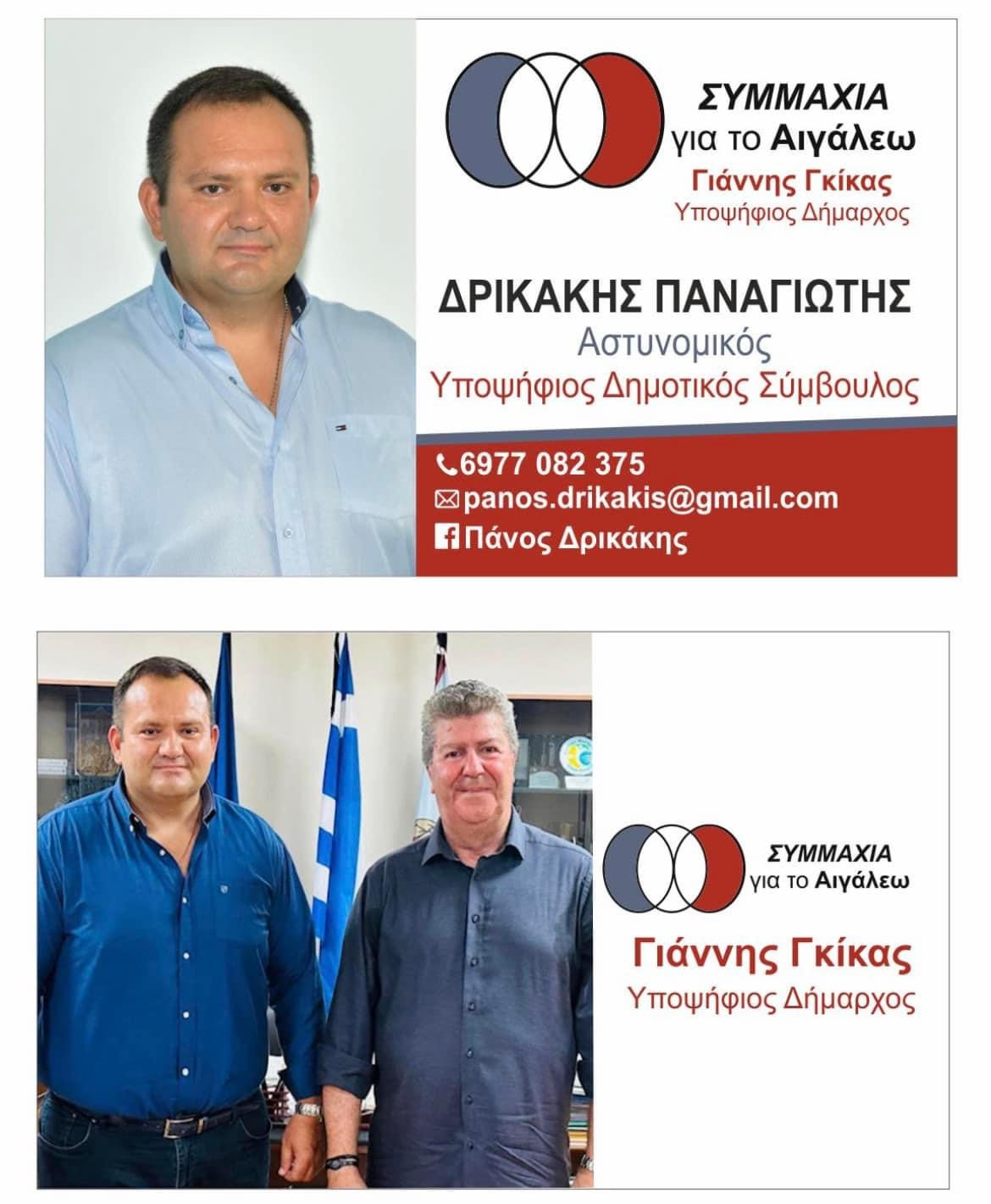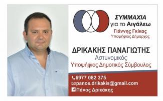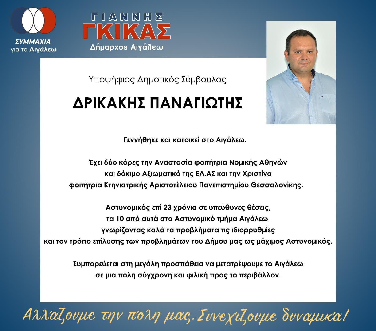 Ο αστυνομικός Παναγιώτης Δρικάκης είναι υποψήφιος Δημοτικός Σύμβουλος στο Δήμο Αιγάλεω με τον συνδυασμό "ΣΥΜΜΑΧΙΑ για το Αιγάλεω" του Γιάννη Γκίκα