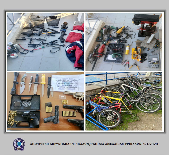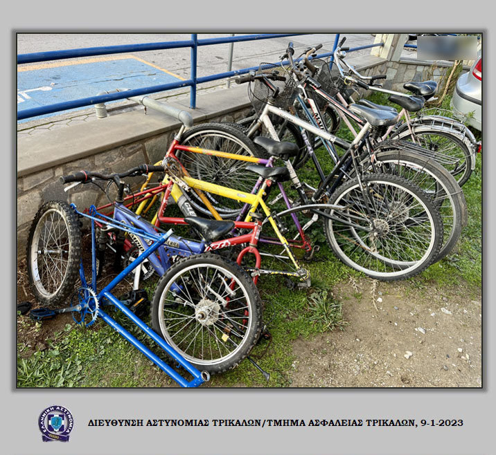 - ποδήλατα και εξαρτήματα αυτών (ρόδες, σέλες, τιμόνια κ.α.), κομμένες κλειδαριές και διάφορα εργαλεία και υλικά, όπως κόφτες μετάλλων, χρώματα σπρέι και διαβρωτικά χρώματος. Από αυτά, προέκυψε ότι -6- ποδήλατα είχαν αφαιρεθεί κατά το χρονικό διάστημα από 11-11-2022 έως 07-01-2023 στα Τρίκαλα, τα οποία αποδόθηκαν στους νόμιμους δικαιούχους, καθώς και