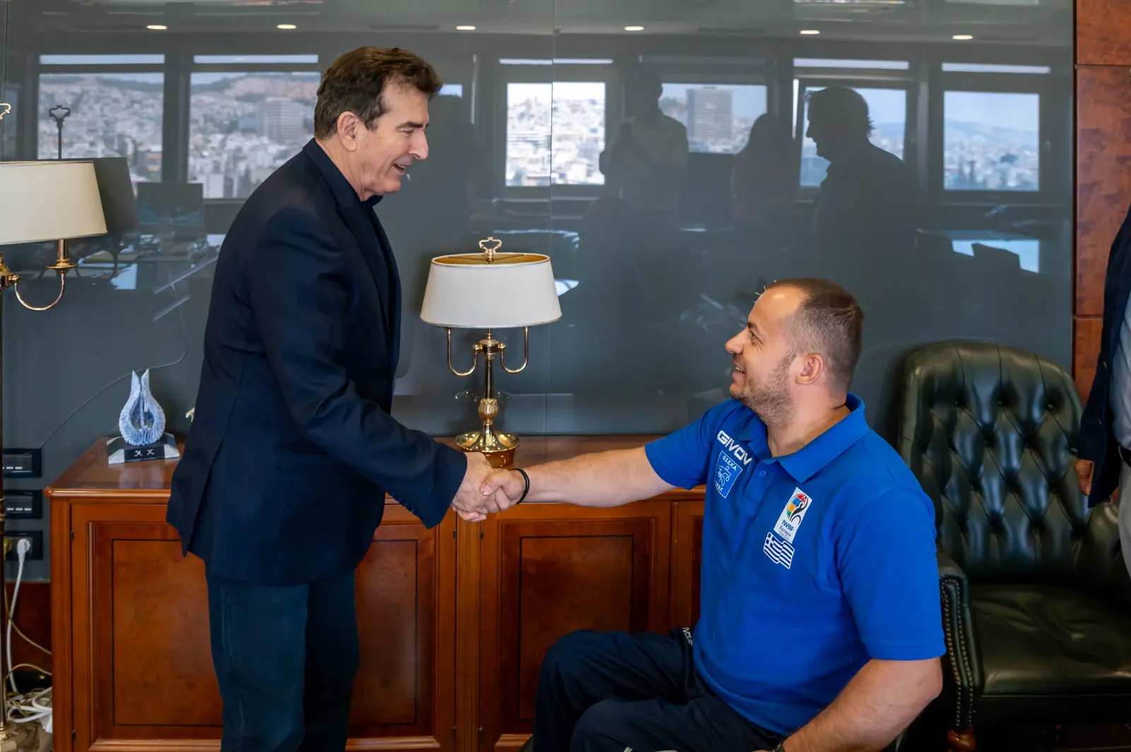 Ο κ. Καλούδης, εκπροσωπώντας το Διοικητικό Συμβούλιο της ΟΣΕΚΑ, μαζί με τον καλαθοσφαιριστή του Α.Σ. ΑΤΛΑΣ και της Εθνικής Ομάδας μπάσκετ με Αμαξίδιο, Αρμάντ Μίνα επισκέφθηκαν τον κ. Υπουργό, προκειμένου να τον ανακηρύξουν σε «Πρεσβευτή Καλής Θέλησης για την καλαθοσφαίριση με αμαξίδιο», τη μέγιστη τιμή της Ομοσπονδίας σε άτομα με σπουδαία προσφορά.
