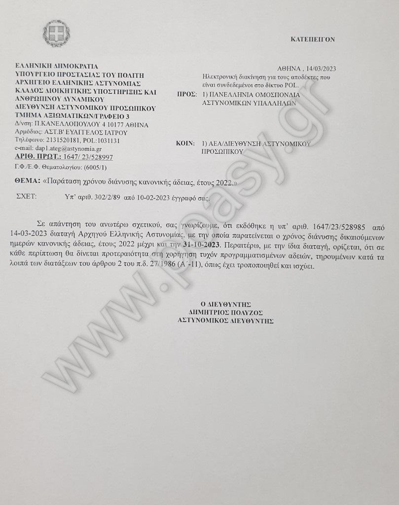 Συνάδελφοι σας κάνουμε γνωστό ότι σε συνέχεια του ανωτέρω σχετικού, εγκρίθηκε η παράταση του χρόνου διάνυσης της κανονικής άδειας, έτους 2022, μέχρι και την 31/10/2023 και παρακαλούμε για την ενημέρωση των μελών σας.