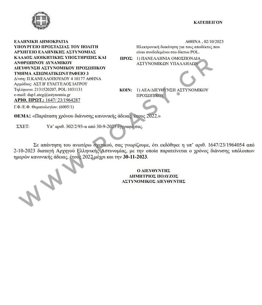 Συνάδελφοι σας κάνουμε γνωστό ότι σε συνέχεια του ανωτέρω σχετικού, εγκρίθηκε η παράταση του χρόνου διάνυσης της κανονικής άδειας, έτους 2022, μέχρι και την 30/11/2023 και παρακαλούμε για την ενημέρωση των μελών σας.