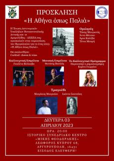 Με μεγάλη χαρά, σας περιμένουμε τη Δευτέρα 03 Απριλίου 2023 και ώρα 20:00 στο Ιστορικό Συνεδριακό Κέντρο «ΜΙΚΗΣ ΘΕΟΔΩΡΑΚΗΣ», επί της Λεωφόρου Κύπρου 68 στην Αργυρούπολη (είσοδος ελεύθερη).