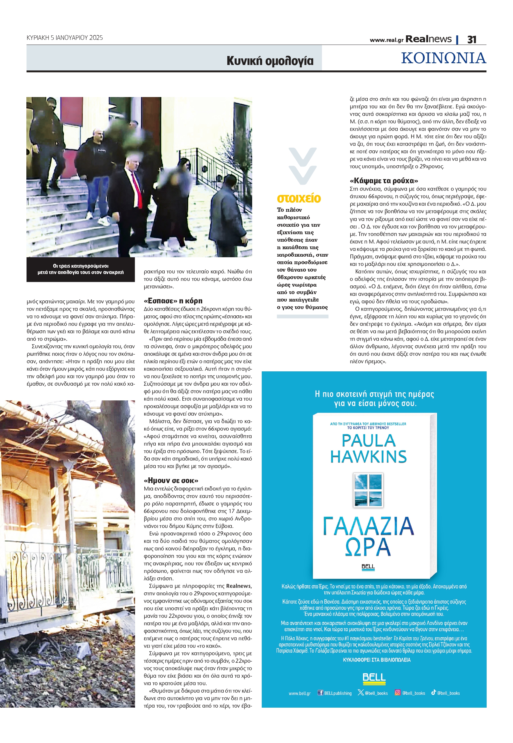 Δύο καταθέσεις έδωσε η 26χρονη κόρη του θύματος, αφού στο τέλος της πρώτης «έσπασε» και ομολόγησε. Λίγες ώρες μετά περιέγραψε με κάθε λεπτομέρεια πώς εκτέλεσαν το σχέδιό τους. «Πριν από περίπου μία εβδομάδα έπεσα από τα σύννεφα, όταν ο μικρότερος αδελφός μου αποκάλυψε σε εμένα και στον άνδρα μου ότι σε ηλικία περίπου έξι ετών ο πατέρας μας τον είχε κακοποιήσει σεξουαλικά. Αυτή ήταν η σταγόνα που ξεχείλισε το ποτήρι της υπομονής μου. Συζητούσαμε με τον άνδρα μου και τον αδελφό μου ότι θα άξιζε στον πατέρα μας να πάθει κάτι πολύ κακό. Έτσι συναποφασίσαμε να του προκαλέσουμε ασφυξία με μαξιλάρι και να το κάνουμε να φανεί σαν ατύχημα».