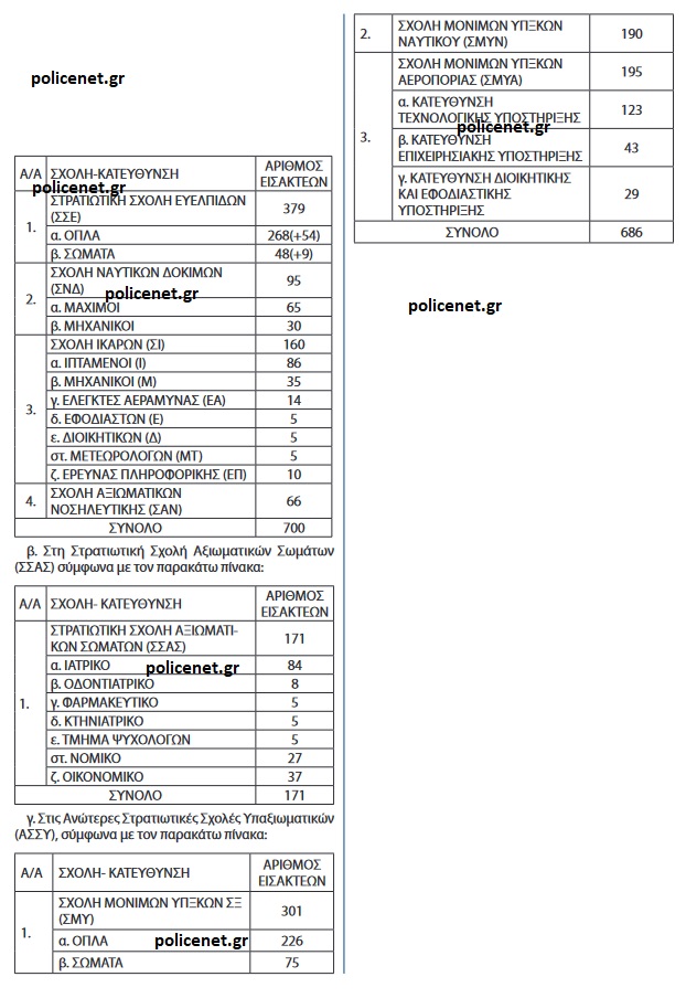 Ο αριθμός των εισακτέων στις Στρατιωτικές Σχολές των Ενόπλων Δυνάμεων (ΕΔ) για το ακαδημαϊκό έτος 2024-2025, κατά Σχολή και Κατευθύνσεις, καθορίζεται ως εξής: