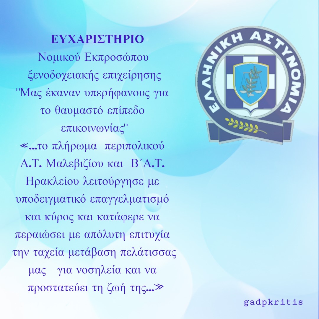 Ευχαριστήρια επιστολή συμπολίτη μας παρουσιάστηκε στη σελίδα στο fb της Γενικής Περιφερειακής Αστυνομικής Διεύθυνσης Κρήτης.