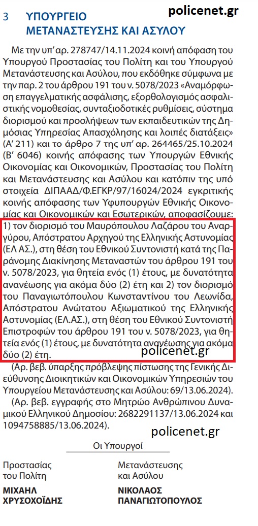 Ο πρώην Αρχηγός της Ελληνικής Αστυνομίας Αντιστράτηγος ε.α. Λάζαρος Μαυρόπουλος τοποθετείται στη θέση του Εθνικού Συντονιστή κατά της Παράνομης Διακίνησης Μεταναστών του άρθρου 191 του ν. 5078/2023, για θητεία ενός (1) έτους, με δυνατότητα ανανέωσης για ακόμα δύο (2) έτη.