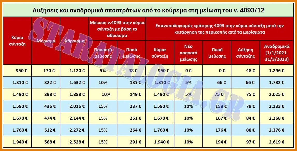 Τα αναδρομικά για τους απόστρατους από τον επανυπολογισμό των κρατήσεων του νόμου 4093 είναι ανάλογα με το ύψος της κύριας σύνταξης και αν η κύρια σύνταξη πέφτει σε μικρότερη κλίμακα κρατήσεων του νόμου 4093 μετά την αφαίρεση του μερίσματος από το άθροισμα ή αν μένει στην ίδια.