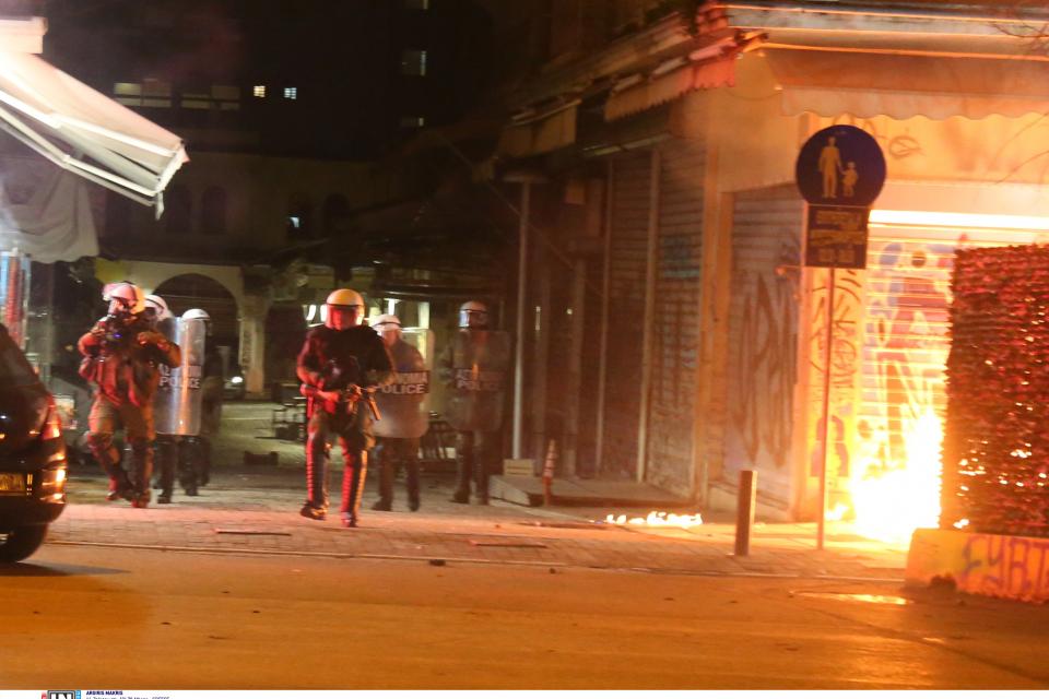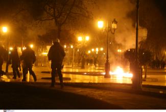 Σύμφωνα με την ert.gr , ομάδα κουκουλοφόρων αποσπάστηκε από την πορεία, έκαψε κάδους, πέταξε βόμβες μολότοφ και άλλα αντικείμενα προς τις διμοιρίες των ΜΑΤ, οι οποίες στη συνέχεια έκαναν χρήση δακρυγόνων.