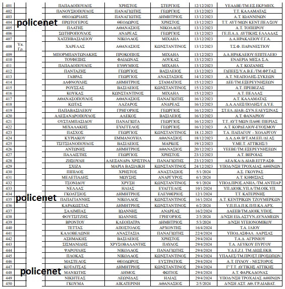 Όπως προβέπει η από 2/5/2024 σχετική Απόφαση του Προϊσταμένου κλάδου Αντιστράτηγου Δημήτριου Μπακόλα, προάγονται, σύμφωνα με τις διατάξεις των άρθρων 3 παρ. 2 και 7 παρ. 7 περ. α ́ του Ν. 3686/2008 όπως ισχύει, στο βαθμό του Υπαστυνόμου Β ́, 450 Ανθυπαστυνόμοι γενικών καθηκόντων (ανακριτικοί υπάλληλοι) που συμπλήρωσαν εννέα (9) έτη πραγματικής υπηρεσίας στο βαθμό τους.