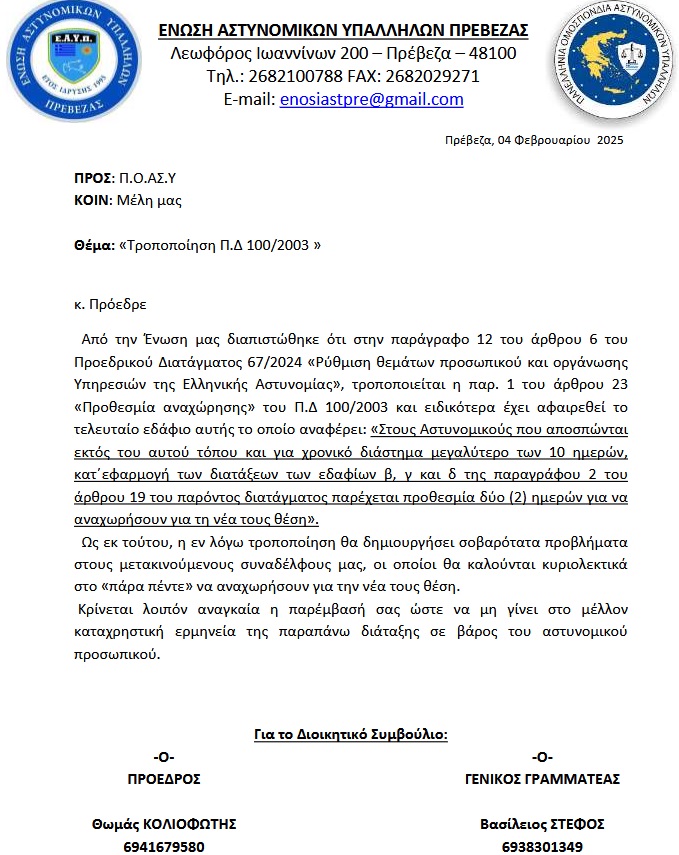Η Ένωση Αστυνομικών Υπαλλήλων Πρέβεζας, με το επισυναπτόμενο έγγραφό της, εκφράζει τον προβληματισμό της για την τροποποίηση του Π.Δ. 100/2003, όπως αυτή αποτυπώθηκε στην παράγραφο 12 του άρθρου 6 του Προεδρικού Διατάγματος 67/2024 «Ρύθμιση θεμάτων προσωπικού και οργάνωσης Υπηρεσιών της Ελληνικής Αστυνομίας».