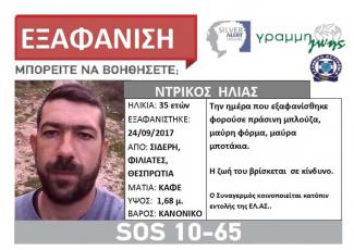 Υπάρχει εξαφάνιση ενηλίκου από την περιοχή Σίδερη, Φιλιατών, Θεσπρωτίας. Εάν γνωρίζετε κάτι επικοινωνήστε με τη ΓΡΑΜΜΗ ΖΩΗΣ, όλο το 24ωρο, στην Εθνική Γραμμή SOS 1065.