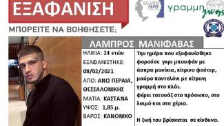 Ο Λάμπρος Μανιφάβας, 24 ετών, την 08/02/2021, εξαφανίστηκε από το σπίτι του στην περιοχή Ραντάρ, στην Άνω Περαία Θεσσαλονίκης. Έχει καστανά μάτια, ύψος 1,85μ και είναι κανονικού βάρους.