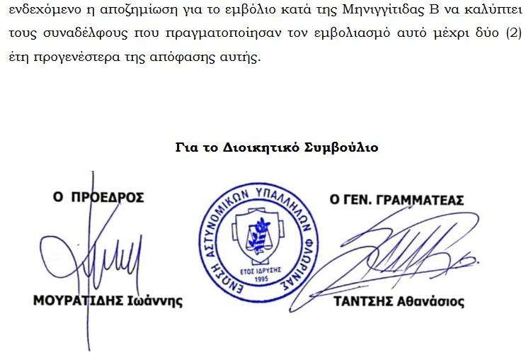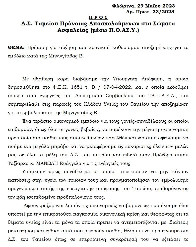 Η Ένωση Αστυνομικών Υπαλλήλων Φλώρινας, όπως προκύπτει και από το επισυναπτόμενο έγγραφό της, χαιρετίζει την απόφαση του Διοικητικού Συμβουλίου του ΤΑ.Π.Α.Σ.Α. με την οποία εντάσσεται στις παροχές του Κλάδου Υγείας και η αποζημίωση για το εμβόλιο κατά της Μηνιγγίτιδας Β’. Έτσι ανακουφίζεται οικονομικά κάθε αστυνομικός που μεριμνά για την υγειονομική προστασία των παιδιών του και γι’ αυτό πραγματικά αξίζουν πολλών συγχαρητηρίων όσοι συνέβαλαν στη λήψη αυτής της απόφασης.