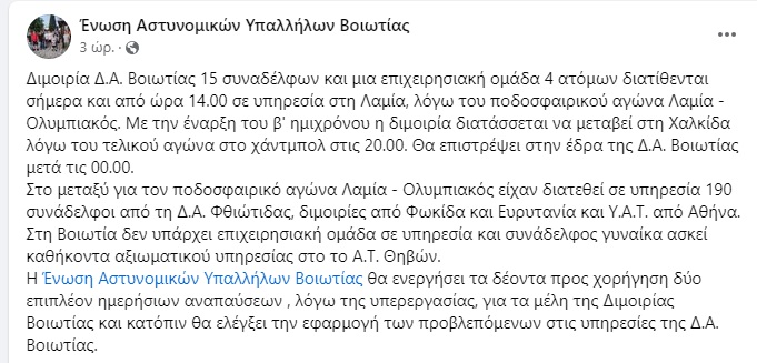 Ανάρτηση από τη σελίδα στο fb της Ένωσης Αστυνομικών Βοιωτίας: