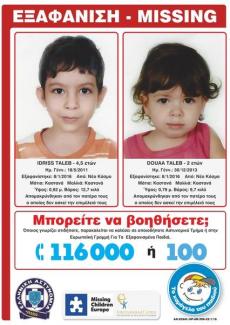 «Στις 08/01/2016 ο Τάλεμπ Ίντρις (4,5 ετών) και η Τάλεμπ Ντουά (2 ετών), την επιμέλεια των οποίων ασκεί η μητέρα τους με προσωρινή διαταγή από τις 7/1/2016, απομακρύνθηκαν από τον πατέρα τους χωρίς νόμιμο δικαίωμα, από την περιοχή του Νέου Κόσμου προς άγνωστη κατεύθυνση. H μητέρα του Ίντρις και της Ντουά, αγωνιά για την τύχη τους και ευελπιστεί στη βοήθεια όλων μας για την ανεύρεσή τους.