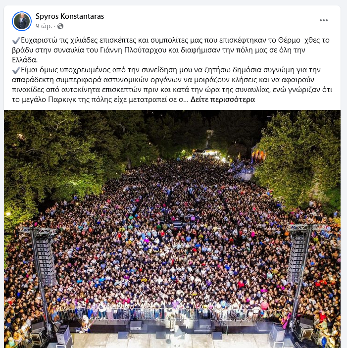 "Ευχαριστώ τις χιλιάδες επισκέπτες και συμπολίτες μας που επισκέφτηκαν το Θέρμο χθες το βράδυ στην συναυλία του Γιάννη Πλούταρχου και διαφήμισαν την πόλη μας σε όλη την Ελλάδα.